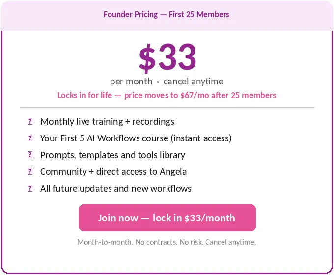 One focused, practical session each month - a workflow, a tool, a system. Not a webinar. A working session you implement during or right after.